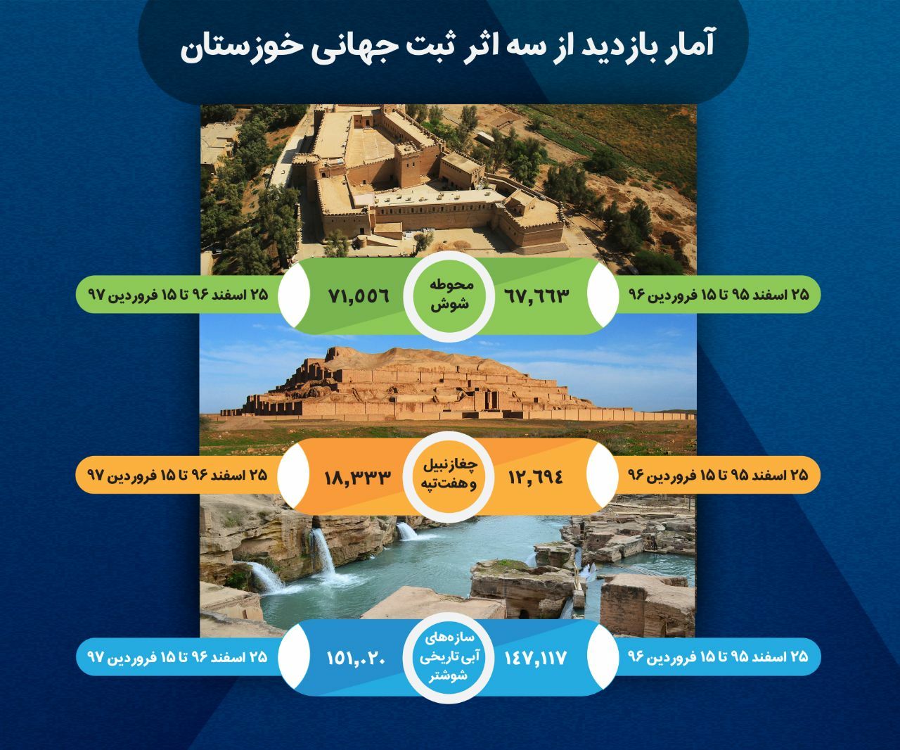 . شوشتر با رقم ۱۵۱۰۲۰ بازدید در ایام تعطیلات نوروزی رکورد بازدید در بین سه اثر ثبت جهانی خوزستان را به خود اختصاص داد. این در حالیست که در همین بازه زمانی سال گذشته ۱۴۷۱۱۷می باشد.