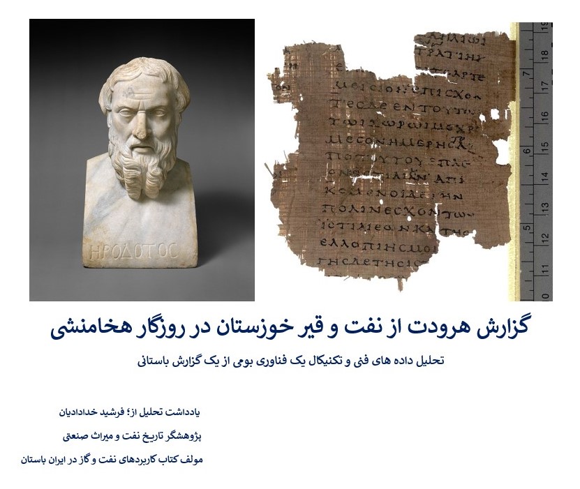 گزارش هرودوت از وجود نفت و قیر در خوزستان روزگار هخامنشی و فناوری بومی توصیف شده از آن گزارشی ارزشمند از پیشینه و میراث صنعتی نفت در روزگار باستان و در ایران هخامنشی است.