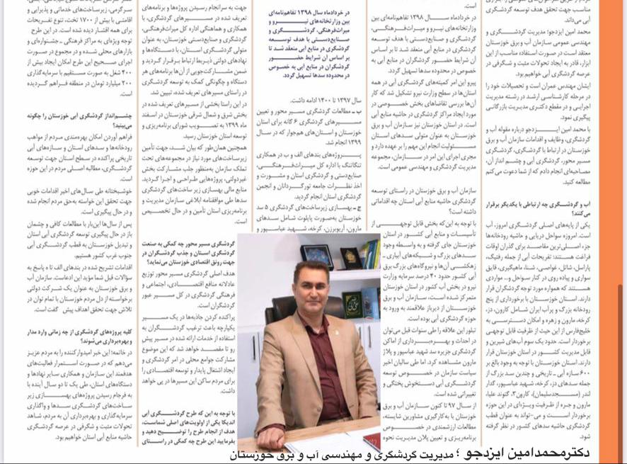 در بخشی از پیام تقدیر این انجمن از جناب آقای دکتر محمدامین ایزدجو ؛ مدیریت محترم سابق گردشگری و مهندسی عمومی سازمان آب و برق خوزستان آمده است: