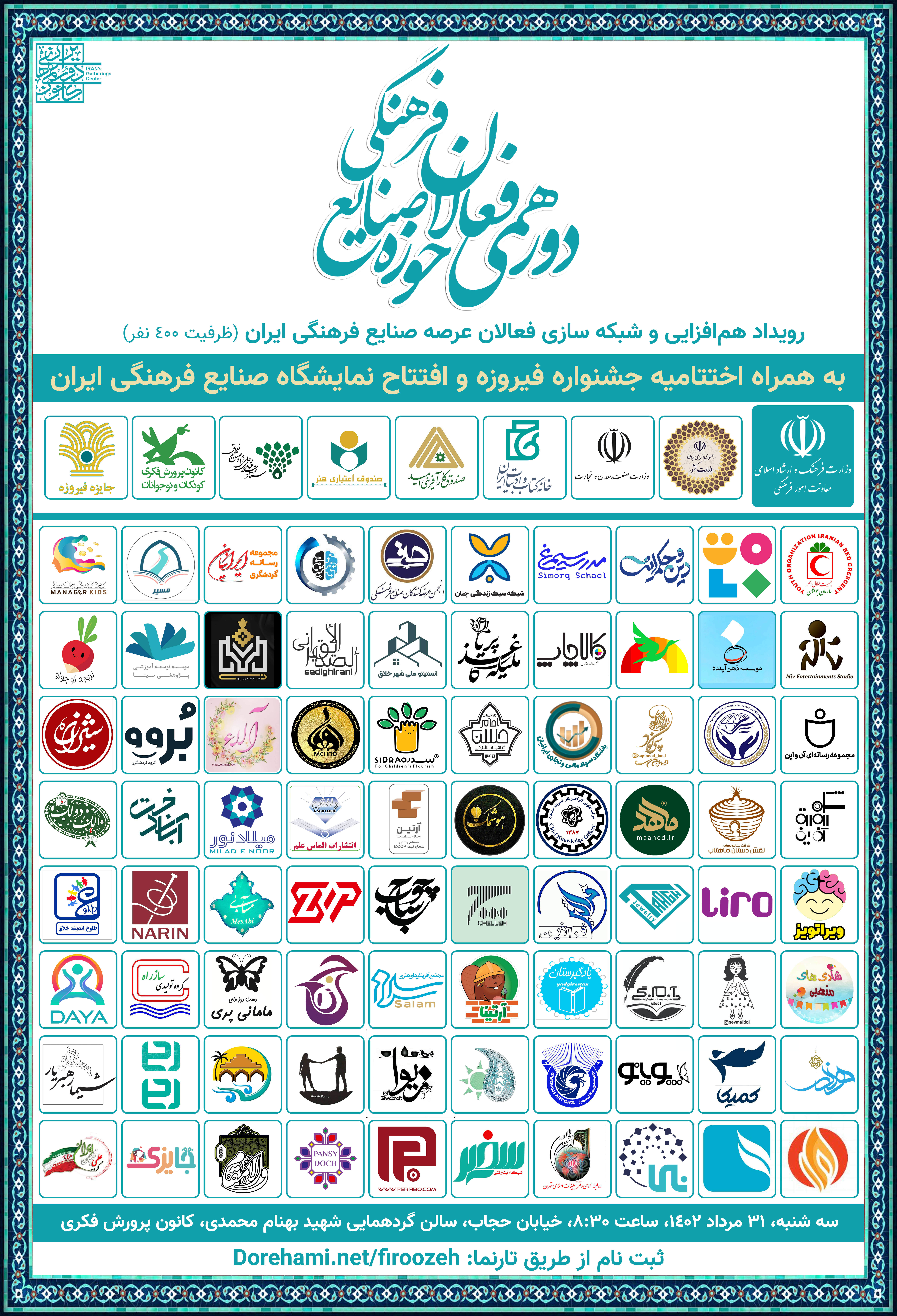 نخستین رویداد دورهمی فعالان برتر حوزه های صنایع فرهنگی، ویژه فعالان این عرصه اعم از؛ تولید کنندگان و فعالان حوزه *صنایع دستی، هدایای فرهنگی، فیلم و انیمیشن، طراحی و تولید پوشاک،اسباب بازی، نوشت افزار و عروسک به همراه دو بخش ویژه فعالان حوزه رسانه و تولید محتوا در زمینه صنایع فرهنگی ، سه شنبه ۳۱ مردادماه ساعت ۸ در تهران، خیابان حجاب، سالن گردهمایی شهید بهنام محمدی کانون پرورش فکری کودکان و نوجوانان به صورت حضوری و آنلاین برگزار خواهد شد