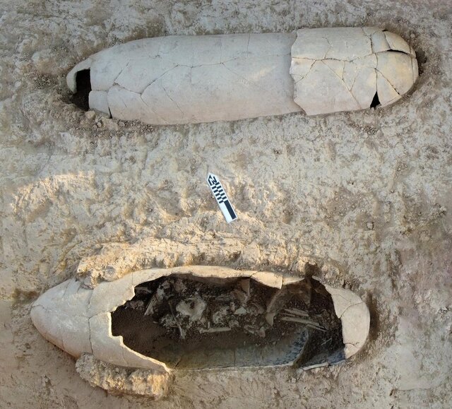 او ادامه داد: در میان گورخفتههای یافتشده، یک کودک مشاهده شد که در این نمونه دهانۀ خمره را با یک تکه سفال شکستهشده بستهاند. روی ساعد اسکلت، شیء آهنی فرسودهای دیده شد که به احتمال زیاد، بقایای یک دستبند یا النگو بوده است.