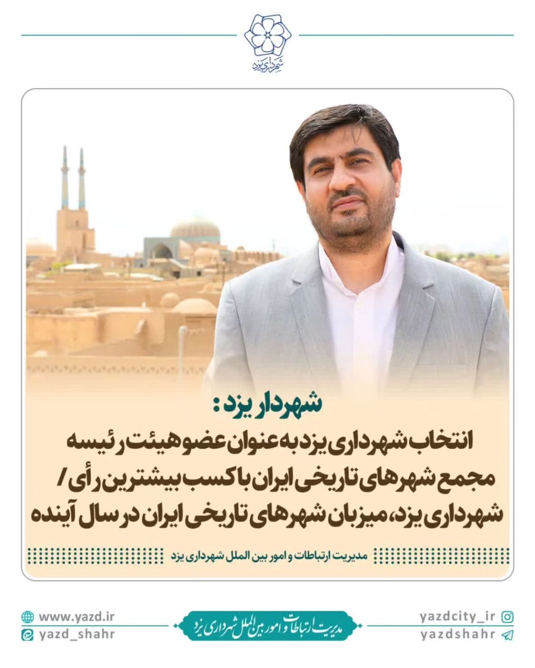 شهرداری یزد با کسب بالاترین رأی به عنوان عضو هیات رئیسه این مجمع شهرهای تاریخی ایران انتخاب شد.
