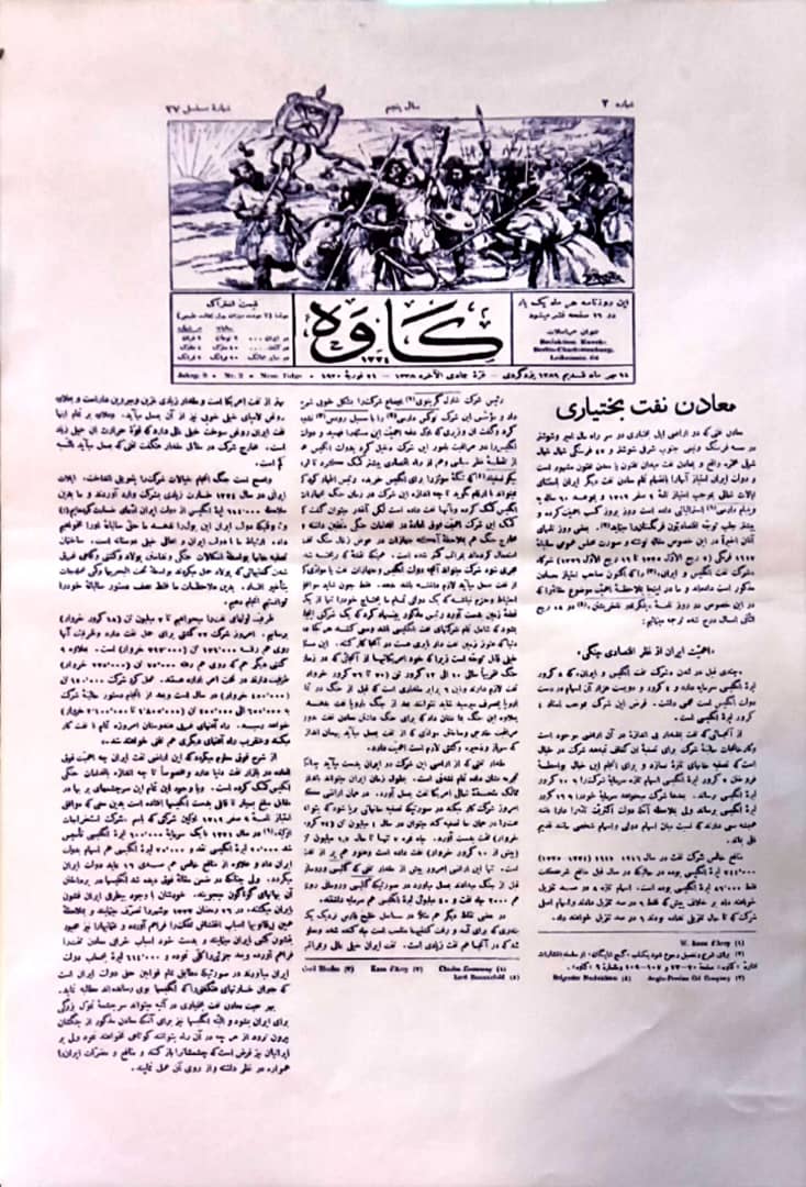 در شماره ی سوم از سال پنجم روزنامه کاوه به شماره مسلسل سی و هفت و تاریخ؛ ۲۴فوریه۱۹۲۰ برابر با چهارم جمادی الآخر(جمادی الثانی)۱۳۳۸هجری قمری که با تطبیق آن با تقویم خورشیدی مصادف بوده با؛ سه شنبه، چهارم اسفندماه سال۱۲۹۸، در صفحه ی نخست روزنامه و در مطلبی با عنوان "معادن نفت بختیاری"، ترجمه مقاله ای منتشر شده در یک روزنامه ی اروپایی را با افزودن تحلیل روزنامه کاوه منتشر شده است.