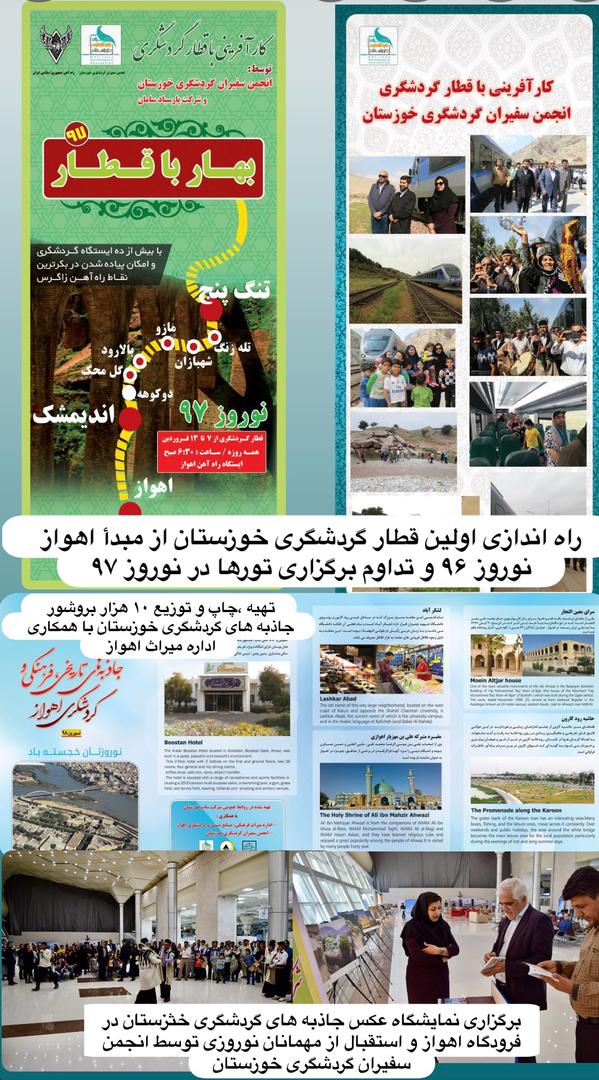 راکی گفت: راه اندازی اولین قطار گردشگری کشور به طور مشترک با شرکت پارسیاد سامان و حمایت و همراهی استانداری خوزستان ،ادارات راه آهن جنوب و زاگرس در نوروز سال ۹۶ از مبدأ اهواز تا ابتدای لرستان ،ایجاد اولین ایستگاه های اطلاع رسانی گردشگری نوروزی و استقبال ازمهمانان نورزی با موسیقی و خوراک محلی خوزستان ،برپایی غرفه سوغات و برگزاری بزرگترین نمایشگاه عکس جاذبه های گردشگری استان با بیش از ۱۰۰ عکس در فرودگاه اهواز از مهمترین فعالیت های این انجمن در سالهای گذشته بوده است که امسال نیز در تلاش به برقراری قطار گردشگری در نوروز ۱۴۰۴ هستیم.