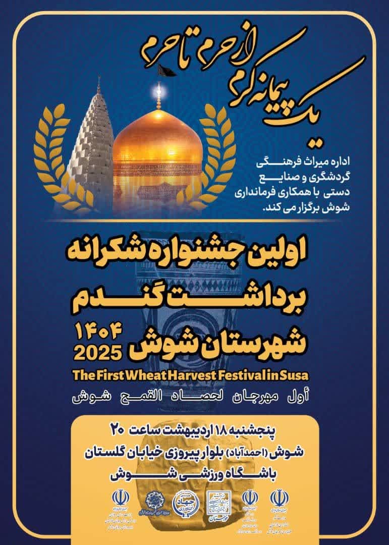 نخستین جشنواره شکرانه برداشت گندم با عنوان «یک پیمانه کرم از حرم تا حرم» در اردیبهشتماه ۱۴۰۴ به میزبانی شهرستان شوش برگزار خواهد شد. این جشنواره با هدف ساماندهی سوغات شهر شوش، ترویج صنایعدستی بومی از جمله محرق ساقه گندم، و پاسداشت تلاش کشاورزان منطقه طراحی شده است.