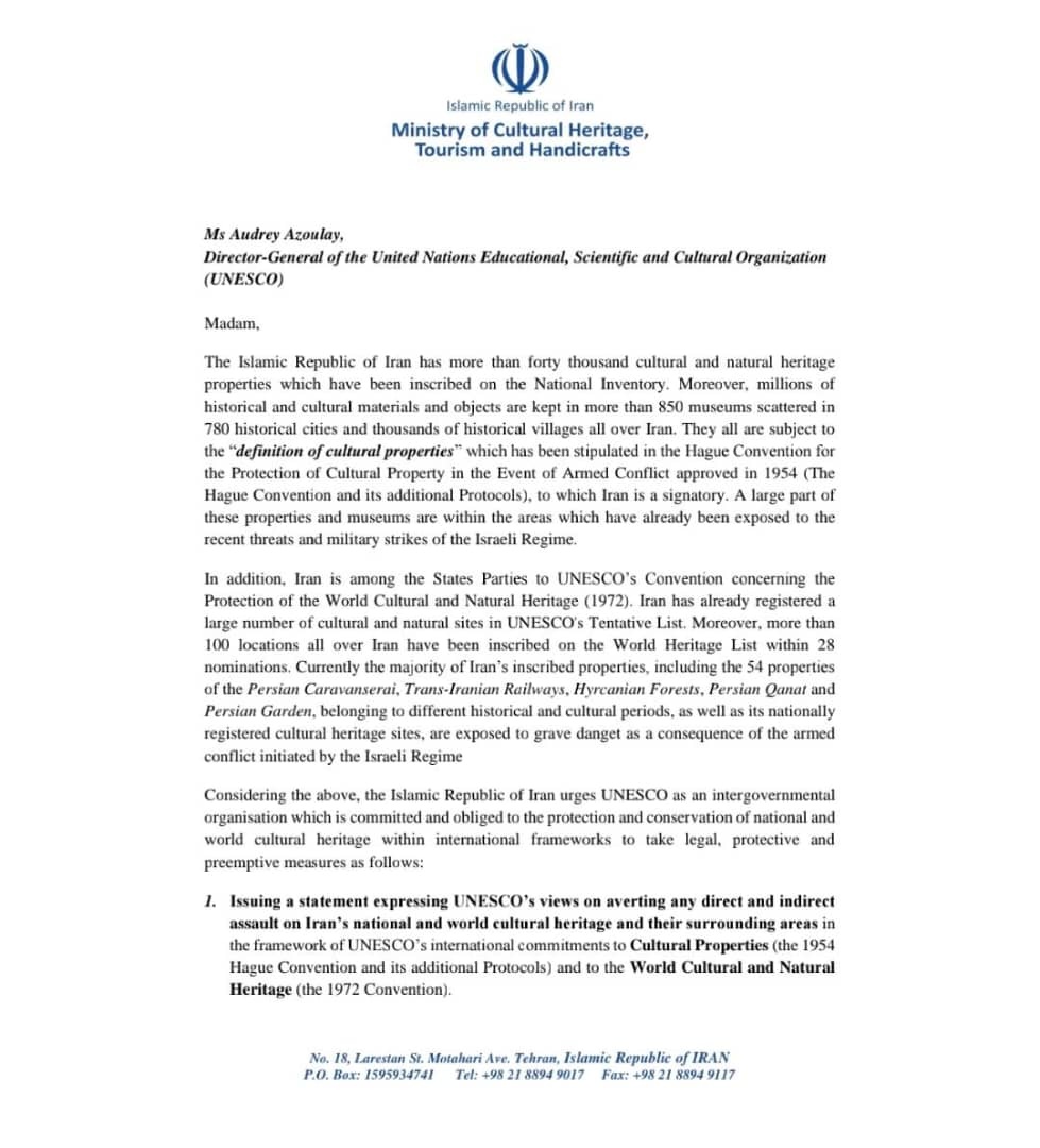 به گزارش میراثآریا، جمهوری اسلامی ایران با ارسال نامهای رسمی به آدری آزولای، دبیرکل سازمان آموزشی، علمی و فرهنگی ملل متحد (یونسکو)، از این نهاد بینالمللی خواست تا برای حفاظت از میراثفرهنگی و طبیعی ایران در برابر تهدیدات ناشی از تجاوزات نظامی اخیر، اقدامات فوری و مؤثری انجام دهد.