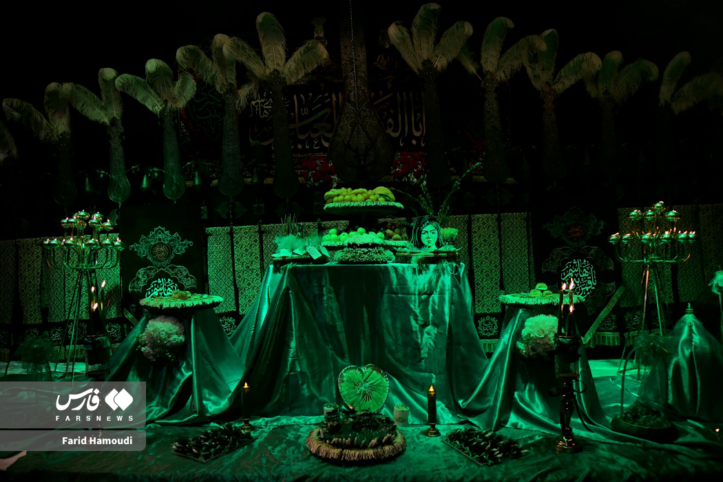 بعد از تزیئن سینیها، آنها را به ردیف قرار داده و با پارچه سبز روی سینیها را میپوشانند.