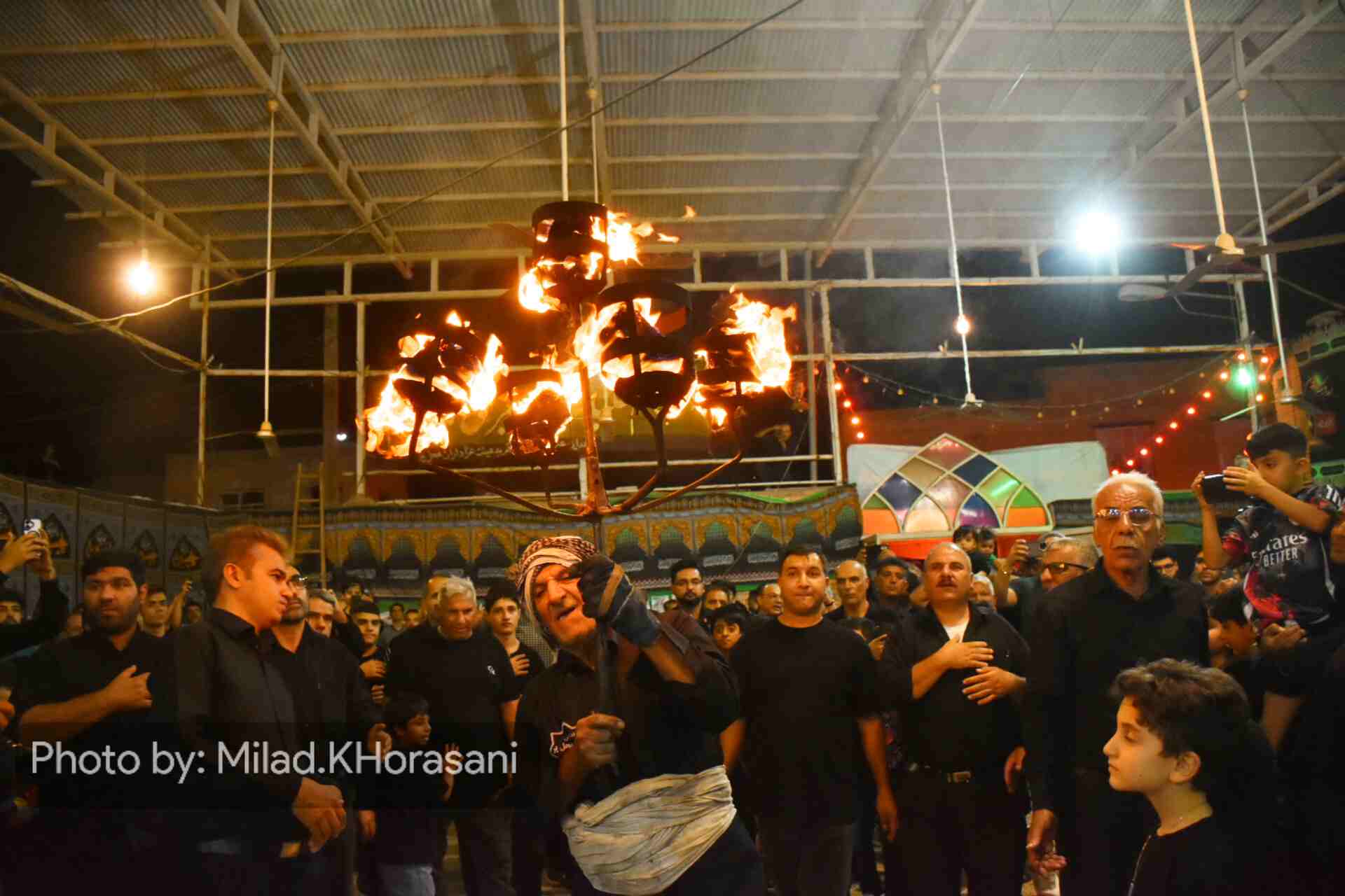 پارچه ها را به شكل لوله شده آماده كرده و درون ظرفی پر از نفت می خیسانند تا دیرتر بسوزند. بعدها بعضی از محله ها از فانوس به جای مشعل استفاده كردند كه راحت تر بود. این مشعل یك نفر چرخاننده و دو نفر همراه كمكی دارد. رسم بر این است كه ابتدا در شب عاشورا میان سینه زنان آن را یك بار می چرخانند و سپس در خانه هایی كه در محدوده ی محله، نذوراتی دارند، چرخانده می شود.
